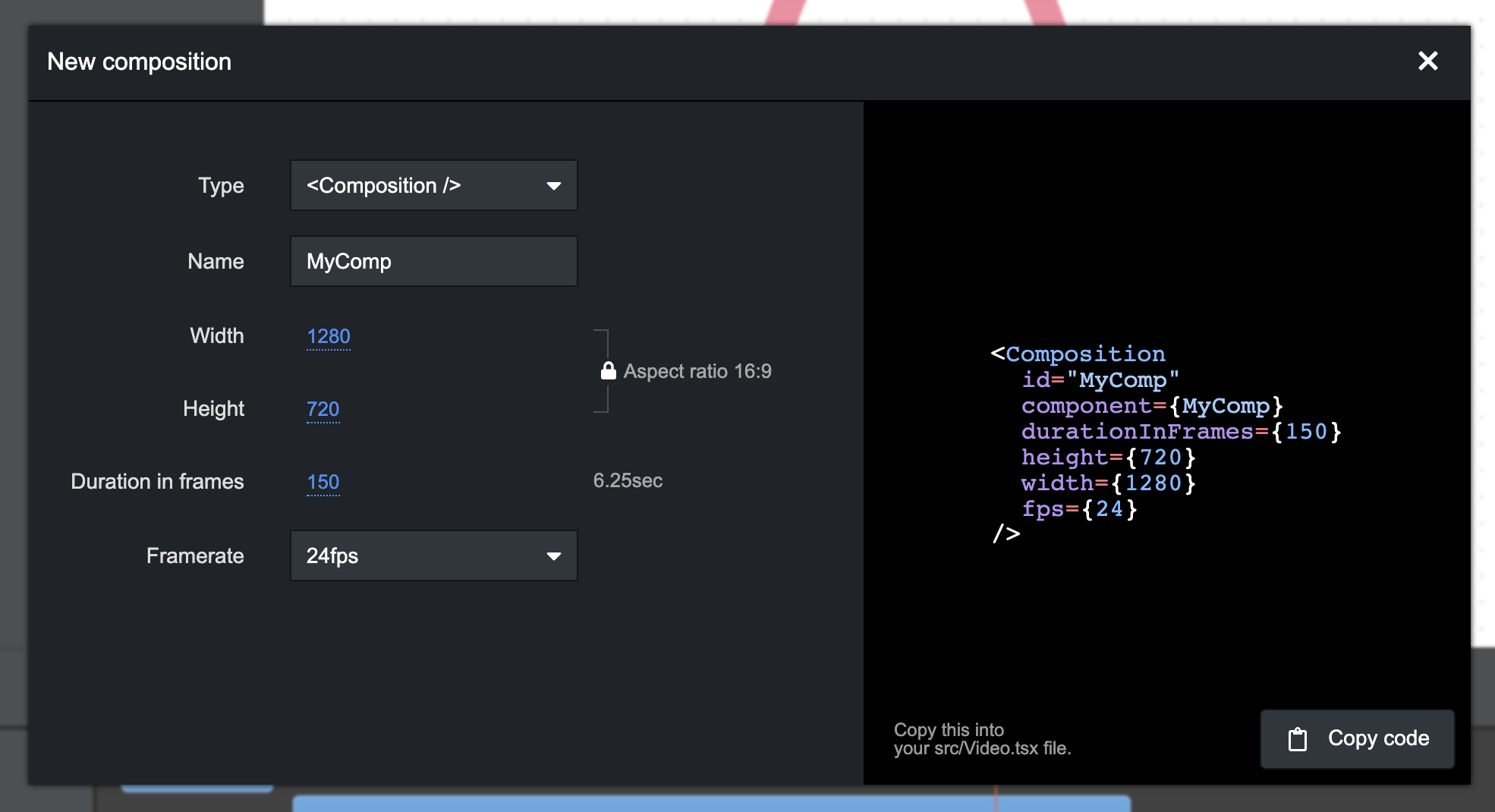 You can press N to bring up a modal that helps you generate code for creating a new <Composition /> or <Still />. Drag the sliders to quickly adjust the dimensions and duration of the video. Lock or unlock the aspect ratio. Click the numbers to enter an exact value. Receive warnings on invalid configuration. Once you are happy with the code, you can click the copy button and paste it in your src/Video.tsx file.